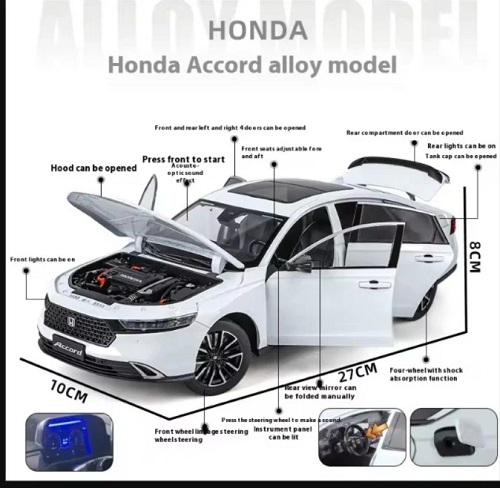 1:18 Scale accuracy Size: 10.5* inches Official Honda Design Premium Alloy Body Detailed Interior & exterior Openable doors, hood & trunk Rubber Tires with Rims Steerable Front Wheels Collector’s Display Model Great Gift for Car Enthusiasts
